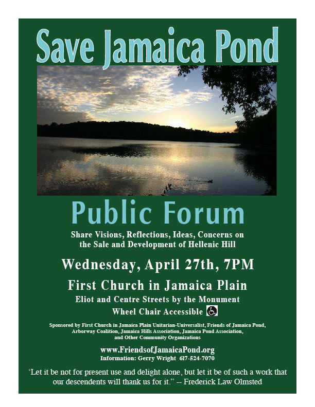 The Fenway Civic Association supports the efforts of the Friends of Jamaica Pond and others to share visions, reflections, ideas and concerns about the sale and development of Hellenic Hill that could threaten Jamaica Pond. The Public Forum will happen on Wednesday, April 27th at 7 PM at the First Church in Jamaica Plain. 6 Eliot Street, Jamaica Plain, MA 02130.