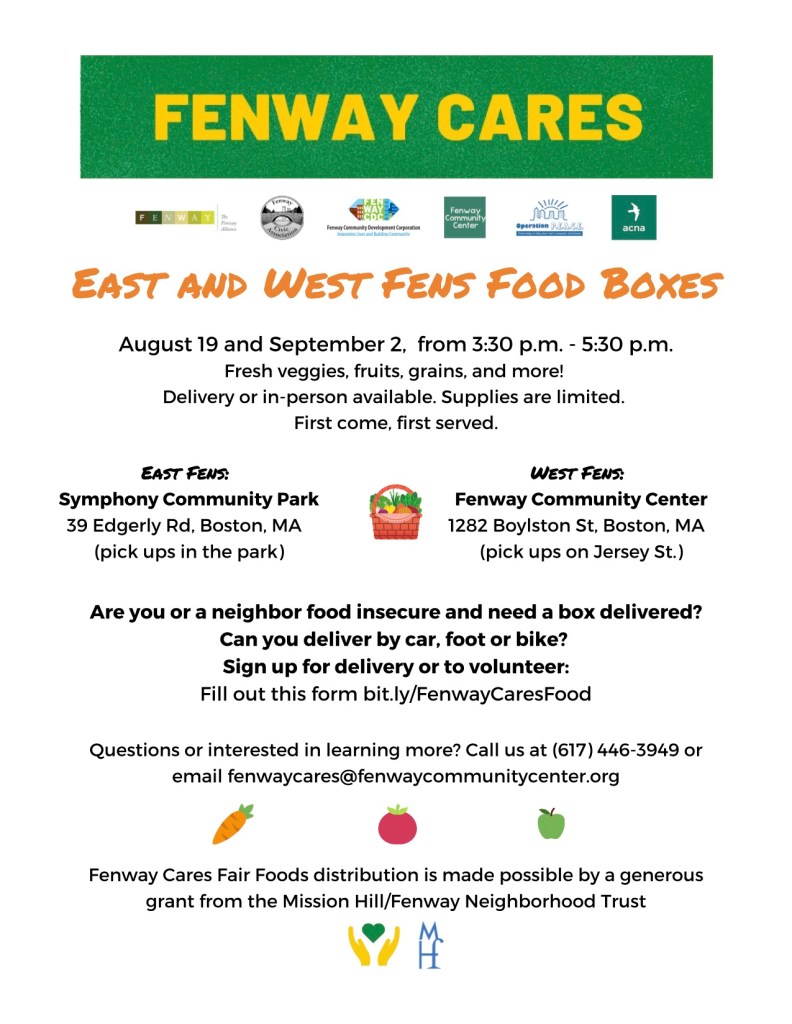 Fenway Cares is a collaborative effort of the Fenway Community Center, Fenway Civic, Fenway Alliance, Fenway CDC, Operation P.E.A.C.E., Audubon Circle Neighborhood Association, and the efforts of Fenway residents.Food distribution is made possible through a generous grant from the Mission Hill/Fenway Neighborhood Trust.