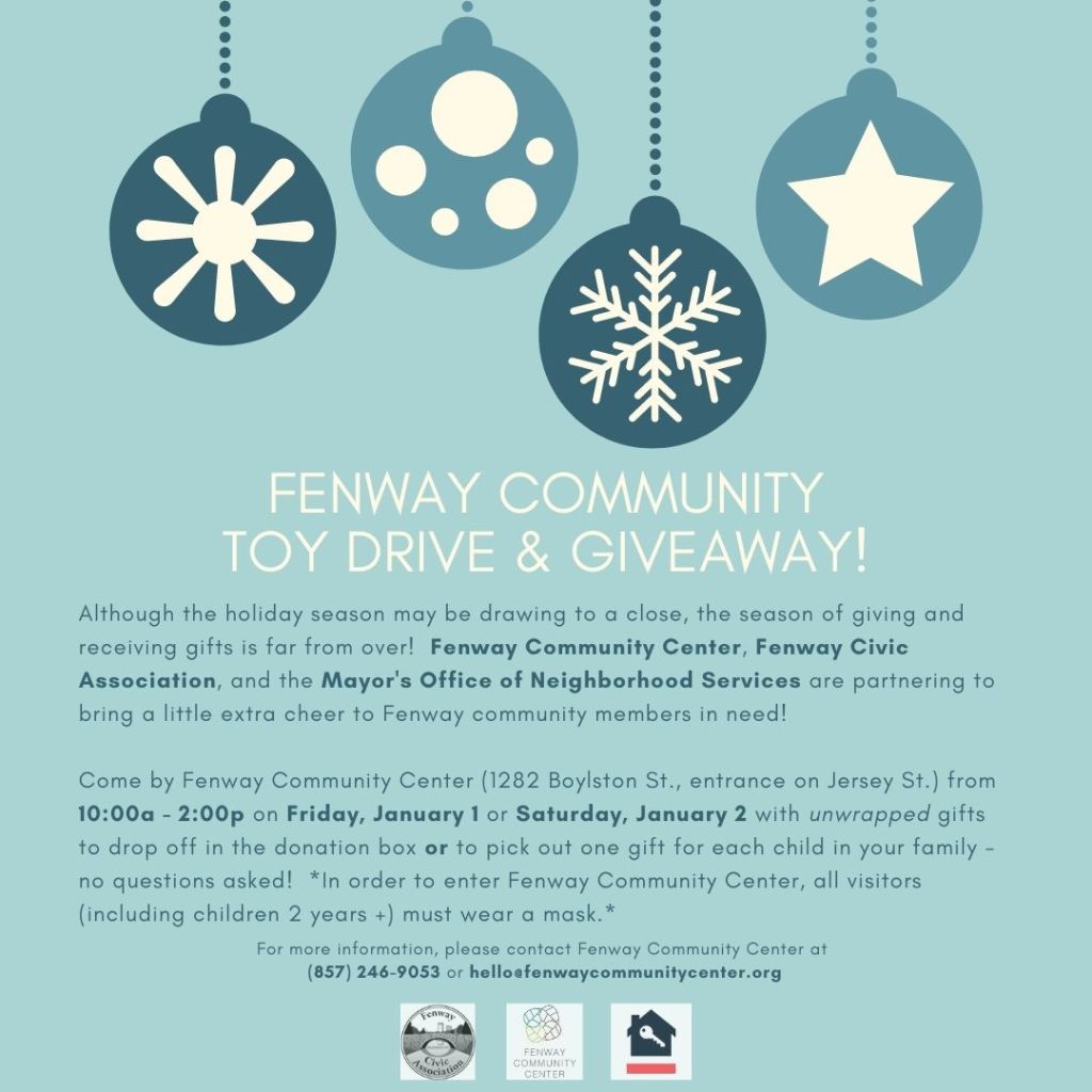 Bring your unwrapped toy to the Fenway Community Center this Friday and Saturday between 10 a.m. – 2 p.m., or drop by to pick up a toy for your child!All remaining donations will be distributed by the Mayor’s Office of Neighborhood Services.