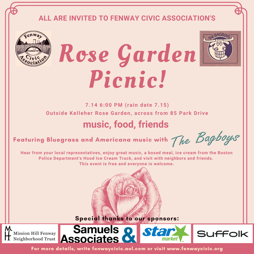 All are invited to the Fenway Civic Association’s picnic, Wednesday July 14th from 6-8 p.m. outside the Kelleher Rose Garden. We’re hoping the weather cooperates and have a great evening in store with Bluegrass/Americana music from The BagBoys supported by The Mission Hill/Fenway Neighborhood Trust, boxed meals thanks to Samuels&Associates, beverages from Star Market Fenway, and support from the Boston Police Hood Ice Cream Truck and chairs, tables, and more from Suffolk Construction. Come hear from your neighborhood representatives and enjoy a stroll in the Kelleher Rose Garden. For more details, see below or write to fenwaycivic@aol.com. This event is free and all are welcome! Special thanks to the Boston Parks and Recreation Department and the Boston Mounted Rangers for helping make this event possible.