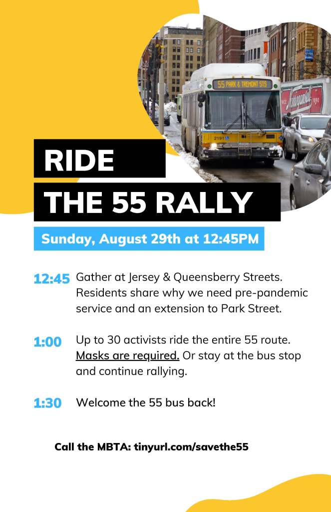 Thanks to the hard work of our representatives and neighbors, the #55 has been restored, but to a reduced schedule and route. Come support your local bus and show why public transit matters for the Fenway!