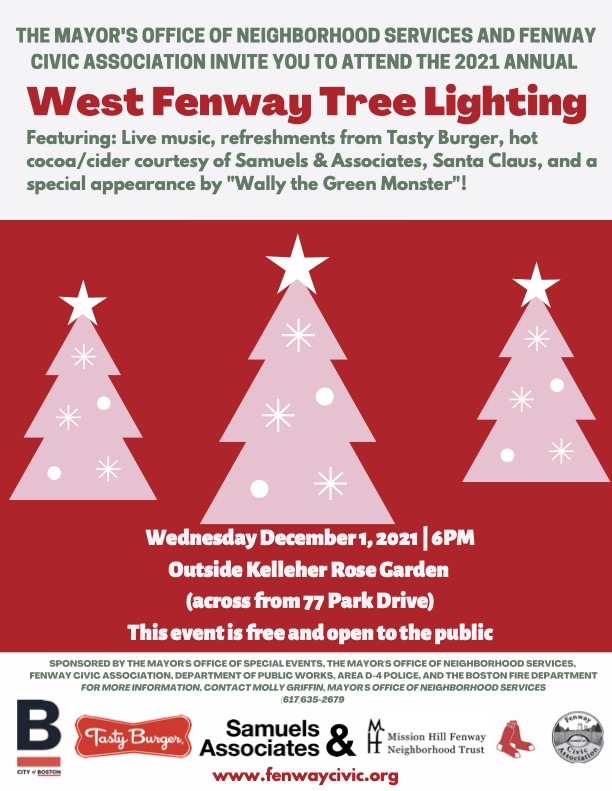 Fenway Civic is excited to announce the date for our annual tree lighting! Come join your neighbors and friends for cider and cocoa and see the tree light up to start the holiday season! Much more detail to come.
