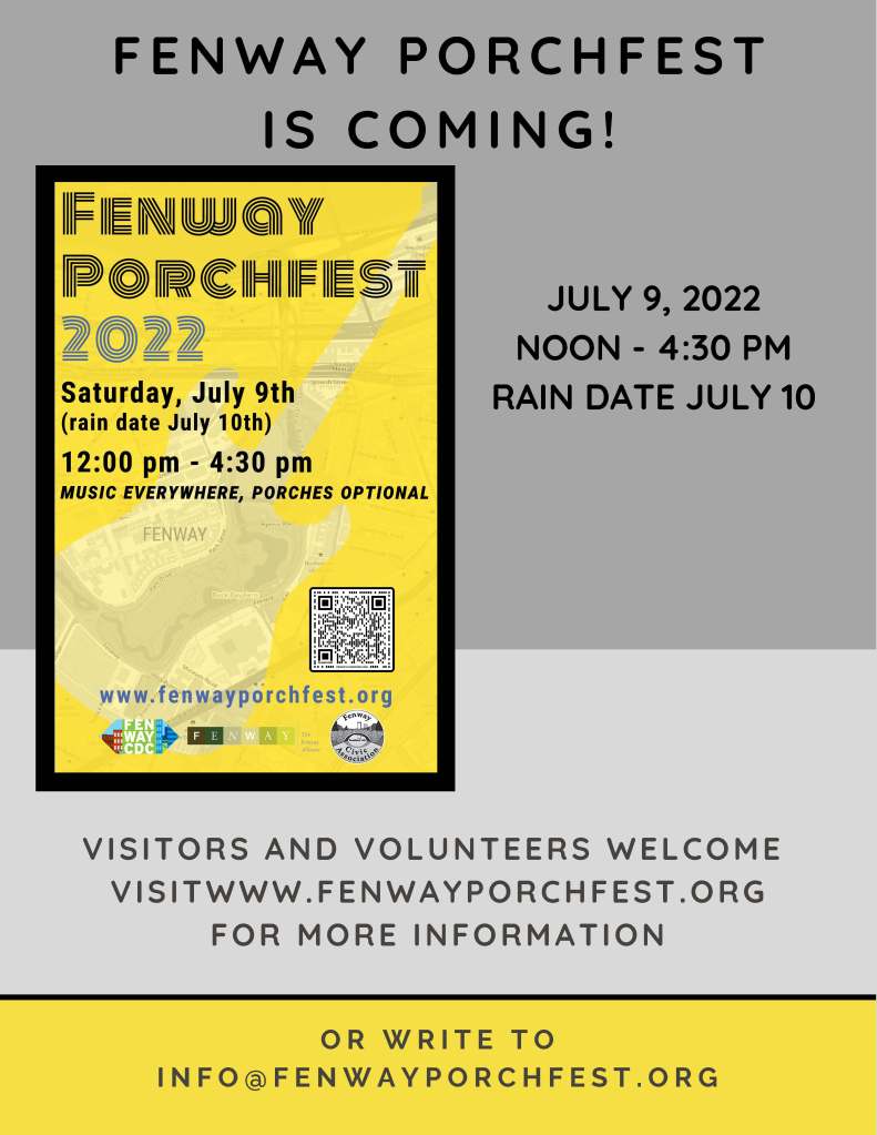 Help welcome musicians throughout the neighborhood at our third in-person Fenway Porchfest!