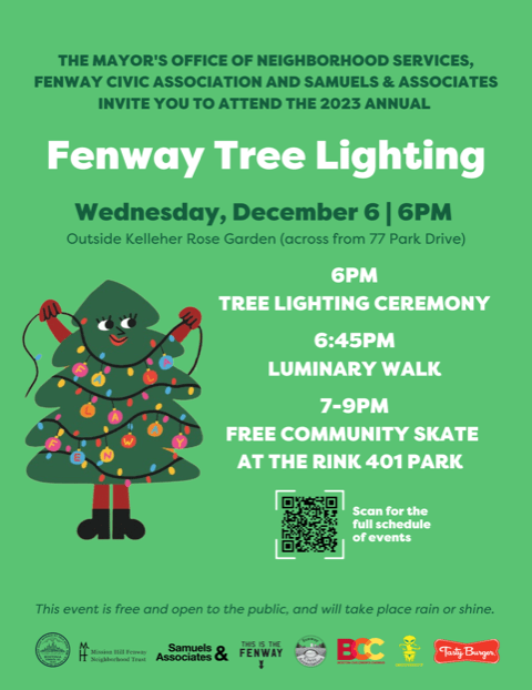 It is our pleasure to invite you to the Fenway’s Annual Tree Lighting on Wednesday, December 6th outside the Kelleher Rose Garden, Back Bay Fens at 6 p.m., sponsored by Fenway Civic Association in partnership with Samuels & Associates and the Mayor’s Office of Neighborhood Services!
